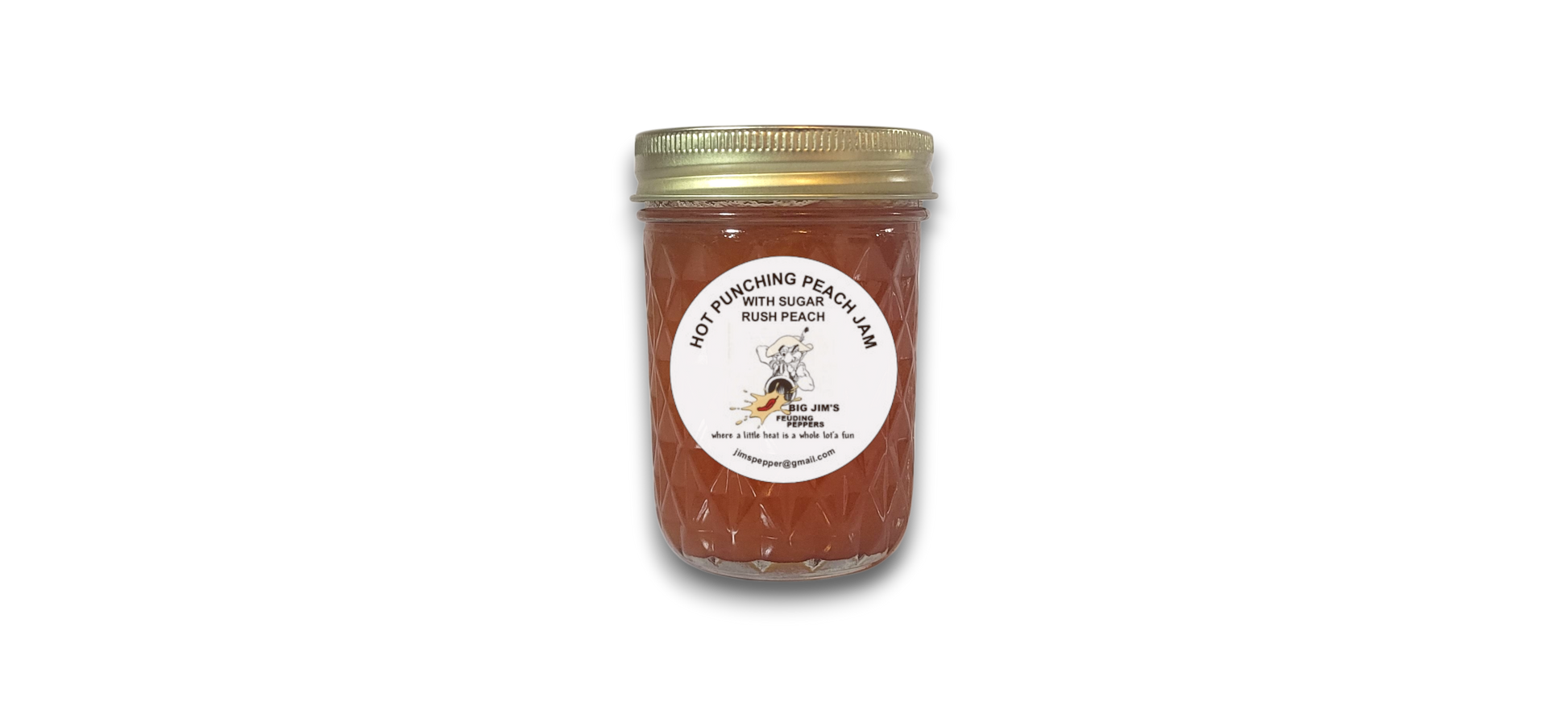 Hot Punching Peach Jam was crafted after a long thought staring out back. The sugar rush peach peppers grow tall in our backyard. They take their time ripening in the sun, soaking up the heat, and developing just the right flavor. Once they're ready, we pair them with ripe peaches, a little lemon, and just enough sugar to keep it all in line.